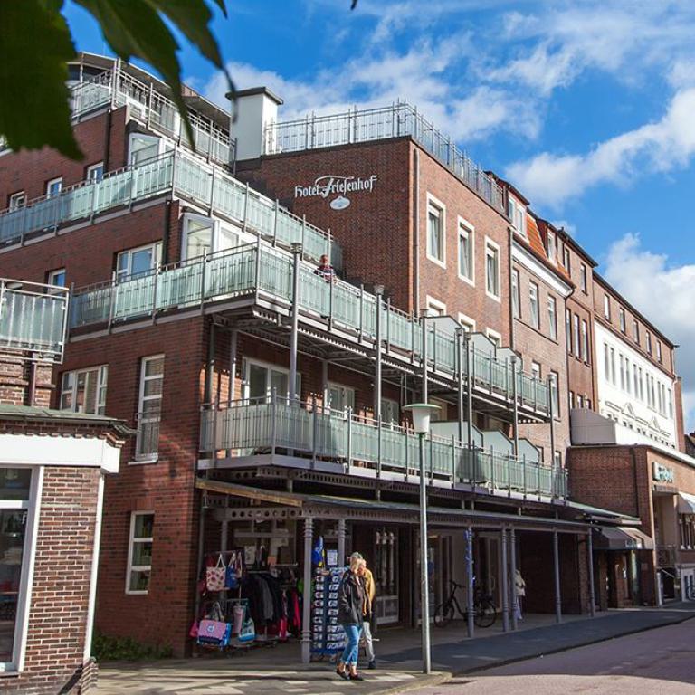Sie wohnen im 3* Hotel Friesenhof, nur ca. 250 m vom Hafen entfernt mitten im Zentrum von Juist am Kurplatz. Das Hotel verfügt über 140 Betten, mehrere Ferienwohnungen und ein Restaurant mit rund 200 Sitzplätzen. Hoch oben, über den Dächern von Juist thront die hoteleigene Saunalandschaft. Wer kein großer Freund von Saunagängen ist, der lässt einfach während eines Bades in der Whirlwanne seinen Blick über das Ostdorf schweifen. Natürlich können Sie auch einfach von der Dachterrasse oder dem Ruheraum aus Ihren Blick über das wunderschönes Töwerland gleiten lassen. Auch ein Hallenschwimmbad sowie im Außenbereich eine Rasenfläche mit Liegenstühlen und ein kleiner Fitnessraum stehen zur Verfügung. Ein Fahrstuhl ist vorhanden.